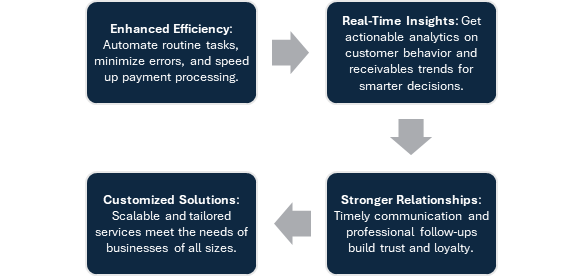 Our Accounts Receivable Services offer unparalleled accuracy and efficiency. They help reduce manual errors, speed up payment processing, and enhance financial reporting. By automating routine tasks, businesses can save time and resources. These services also provide real-time insights, helping you make informed financial decisions.